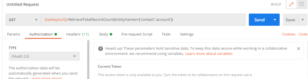 GET {{webapiurl}}/RetrieveTotalRecordCount(EntityNames=[‘contact’,’account’])